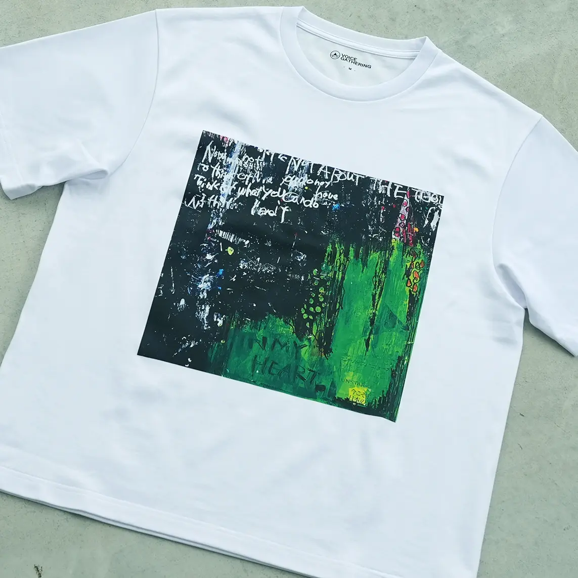 ■作品テーマ 使い古された黒いビニールシートをキャンバスに、人間の奥底に潜む複雑で原始的な感情を、色彩と言葉(words)の層で力強く描き出す。自らの環境の残響として刻まれた、塗料の痕の上に、自分自身を奮い立たせ、湧き上がる言葉、色、質感を重ねていく。その行為は、過去から現在、そして一歩先の未来へと続く、心の軌跡の可視化である。 ・前後でプリント位置を選んでいただけます。